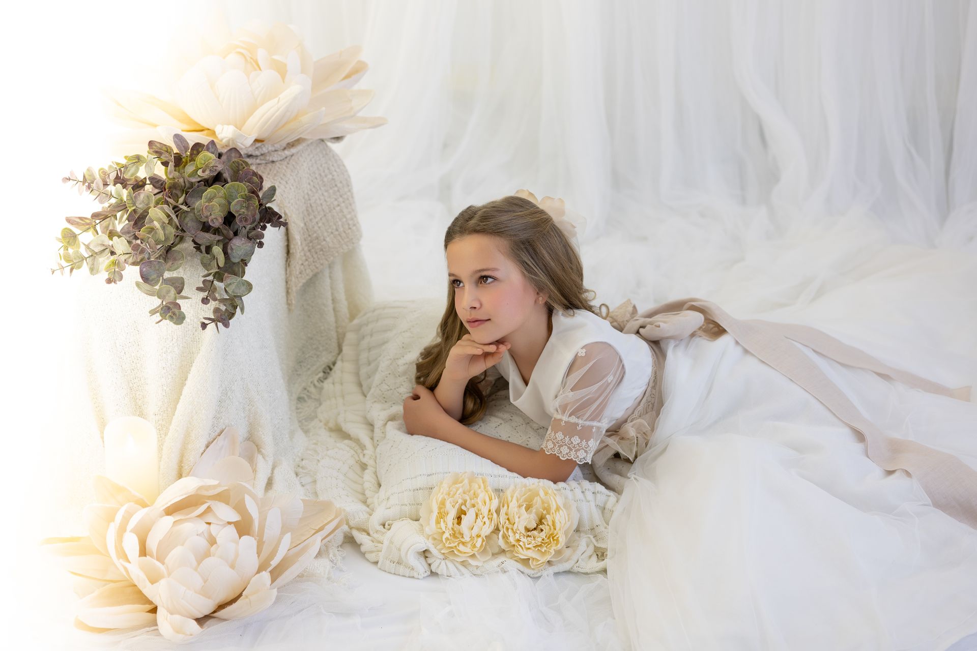 Para las comuniones, creamos escenarios especiales, con fondos de telas suaves y composiciones cuidadas, lejos de lo convencional. Queremos que cada imagen refleje su esencia, con un estilo fresco, innovador y acorde a las tendencias actuales. Nos alejamos de lo típico para ofreceros un recuerdo atemporal y lleno de emoción.